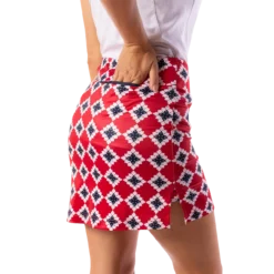 This brand new styled Serendipity Pull-On Tech Skort is designed for the golf course. Golftini’s new design is offered in a fun red, white and blue print with a navy grosgrain ribbon trim on the back pocket. The 17.5” length with 3” contoured waistband and built-in, loose fitting shorts underneath extend the comfort and come in a wrinkle free construction. A hidden front tee pocket and back scorecard pocket provide room for the course necessities.